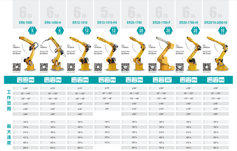 六軸工業(yè)機器人,有效臂長1450MM-3500MM;最大負載6KG-500KG.